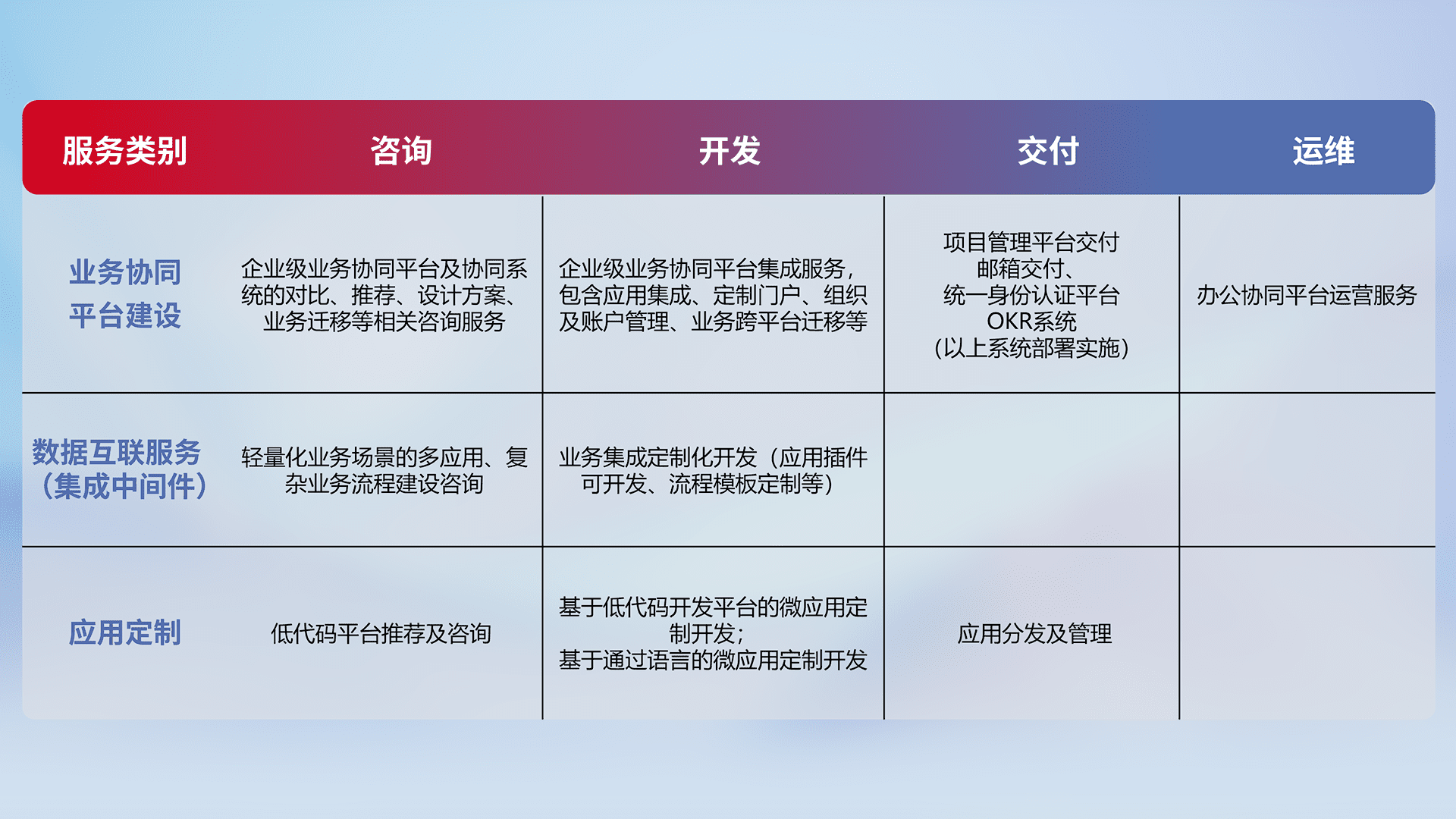 针对钉钉、、企微、、IDaas等平台级产品提供产品的规划、、、、方案、、交付、、、定制化开发等服务,,,实现如统一协同办公、、、、智能客户服务、、混合会议管理、、、、智能数据查询、、、、等业务场景,,,实现数字化转型。。